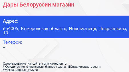 Дары Белоруссии, магазин по адресу 654005, Кемеровская область, Новокузнецк, Покрышкина, 13 в дальнейшем Организация, размещена в следующих категориях: