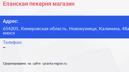 Еланская пекарня, магазин по адресу 654201, Кемеровская область, Новокузнецк, Калинина, 48а киоск в дальнейшем Организация, размещена в следующих категориях: