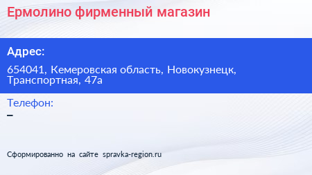 Ермолино, фирменный магазин по адресу 654041, Кемеровская область, Новокузнецк, Транспортная, 47а в дальнейшем Организация, размещена в следующих категориях: