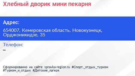 Хлебный дворик, мини-пекарня по адресу 654007, Кемеровская область, Новокузнецк, Орджоникидзе, 35 в дальнейшем Организация, размещена в следующих категориях: