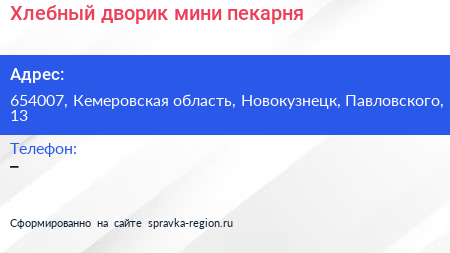 Хлебный дворик, мини-пекарня по адресу 654007, Кемеровская область, Новокузнецк, Павловского, 13 в дальнейшем Организация, размещена в следующих категориях: