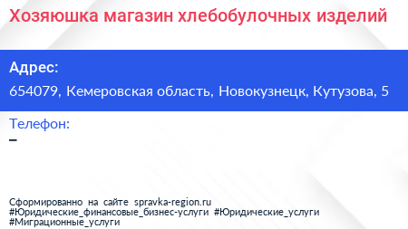Хозяюшка, магазин хлебобулочных изделий по адресу 654079, Кемеровская область, Новокузнецк, Кутузова, 5 в дальнейшем Организация, размещена в следующих категориях: