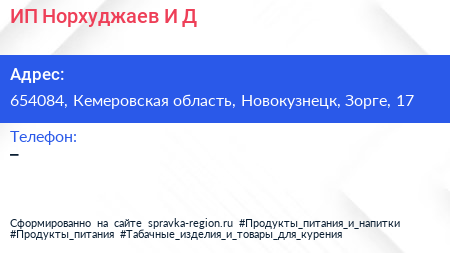 ИП Норхуджаев И.Д. по адресу 654084, Кемеровская область, Новокузнецк, Зорге, 17 в дальнейшем Организация, размещена в следующих категориях: