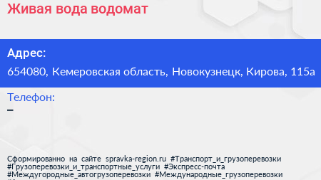 Живая вода, водомат по адресу 654080, Кемеровская область, Новокузнецк, Кирова, 115а в дальнейшем Организация, размещена в следующих категориях: