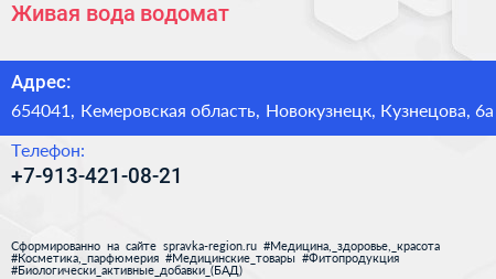 Живая вода, водомат по адресу 654041, Кемеровская область, Новокузнецк, Кузнецова, 6а в дальнейшем Организация, размещена в следующих категориях:
