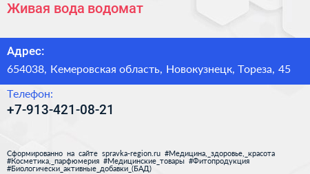 Живая вода, водомат по адресу 654038, Кемеровская область, Новокузнецк, Тореза, 45 в дальнейшем Организация, размещена в следующих категориях: