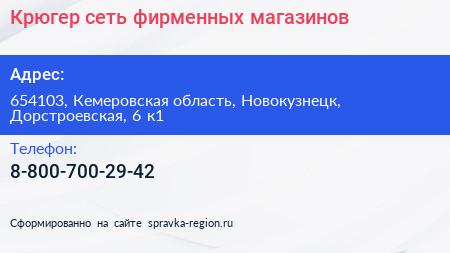 Крюгер, сеть фирменных магазинов по адресу 654103, Кемеровская область, Новокузнецк, Дорстроевская, 6 к1 в дальнейшем Организация, размещена в следующих категориях:
