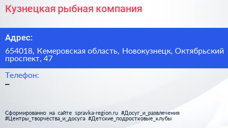 Кузнецкая рыбная компания по адресу 654018, Кемеровская область, Новокузнецк, Октябрьский проспект, 47 в дальнейшем Организация, размещена в следующих категориях:
