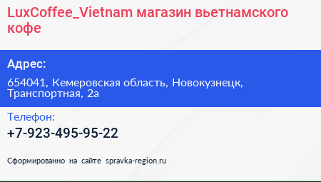 LuxCoffee_Vietnam, магазин вьетнамского кофе по адресу 654041, Кемеровская область, Новокузнецк, Транспортная, 2а в дальнейшем Организация, размещена в следующих категориях:
