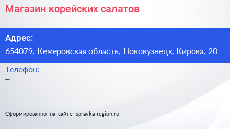 Магазин корейских салатов по адресу 654079, Кемеровская область, Новокузнецк, Кирова, 20 в дальнейшем Организация, размещена в следующих категориях: