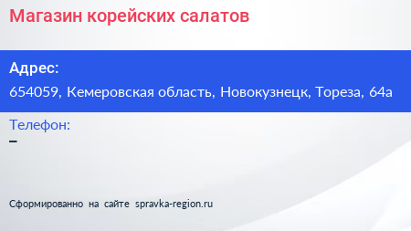 Магазин корейских салатов по адресу 654059, Кемеровская область, Новокузнецк, Тореза, 64а в дальнейшем Организация, размещена в следующих категориях: