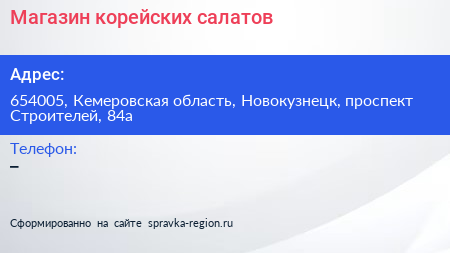 Магазин корейских салатов по адресу 654005, Кемеровская область, Новокузнецк, проспект Строителей, 84а в дальнейшем Организация, размещена в следующих категориях: