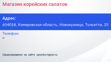 Магазин корейских салатов по адресу 654018, Кемеровская область, Новокузнецк, Тольятти, 25 в дальнейшем Организация, размещена в следующих категориях: