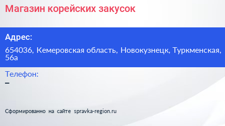 Магазин корейских закусок по адресу 654036, Кемеровская область, Новокузнецк, Туркменская, 56а в дальнейшем Организация, размещена в следующих категориях: