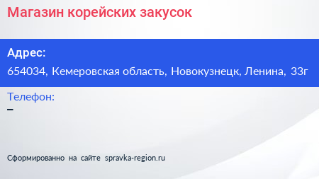 Магазин корейских закусок по адресу 654034, Кемеровская область, Новокузнецк, Ленина, 33г в дальнейшем Организация, размещена в следующих категориях: