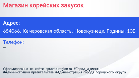 Магазин корейских закусок по адресу 654066, Кемеровская область, Новокузнецк, Грдины, 10Б в дальнейшем Организация, размещена в следующих категориях: