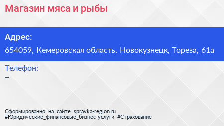 Магазин мяса и рыбы по адресу 654059, Кемеровская область, Новокузнецк, Тореза, 61а в дальнейшем Организация, размещена в следующих категориях: