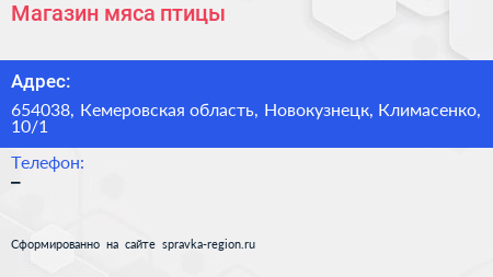 Магазин мяса птицы по адресу 654038, Кемеровская область, Новокузнецк, Климасенко, 10/1 в дальнейшем Организация, размещена в следующих категориях: