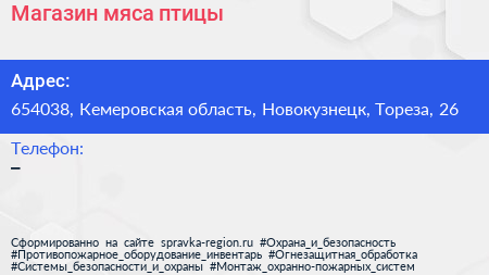 Магазин мяса птицы по адресу 654038, Кемеровская область, Новокузнецк, Тореза, 26 в дальнейшем Организация, размещена в следующих категориях: