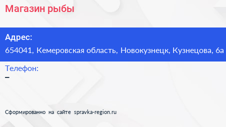 Магазин рыбы по адресу 654041, Кемеровская область, Новокузнецк, Кузнецова, 6а в дальнейшем Организация, размещена в следующих категориях: