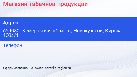 Магазин табачной продукции по адресу 654080, Кемеровская область, Новокузнецк, Кирова, 103а/1 в дальнейшем Организация, размещена в следующих категориях: