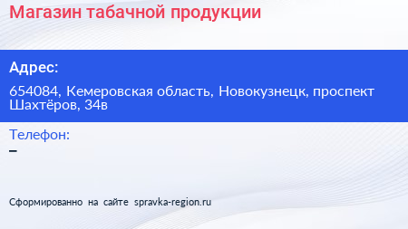 Магазин табачной продукции по адресу 654084, Кемеровская область, Новокузнецк, проспект Шахтёров, 34в в дальнейшем Организация, размещена в следующих категориях: