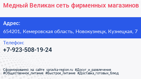 Медный Великан, сеть фирменных магазинов по адресу 654201, Кемеровская область, Новокузнецк, Кузнецкая, 7 в дальнейшем Организация, размещена в следующих категориях: