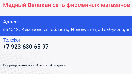 Медный Великан, сеть фирменных магазинов по адресу 654013, Кемеровская область, Новокузнецк, Толбухина, 64 в дальнейшем Организация, размещена в следующих категориях: