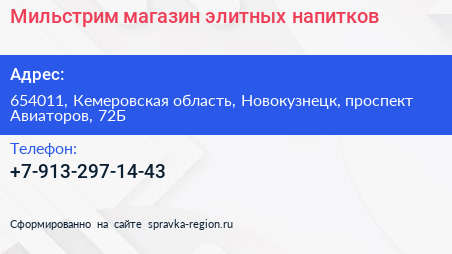 Мильстрим, магазин элитных напитков по адресу 654011, Кемеровская область, Новокузнецк, проспект Авиаторов, 72Б в дальнейшем Организация, размещена в следующих категориях: