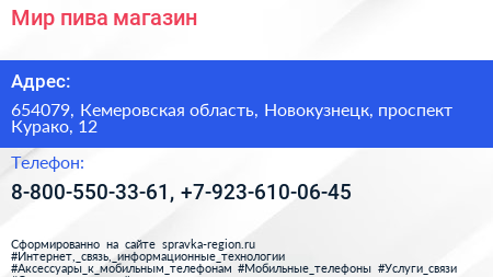 Мир пива, магазин по адресу 654079, Кемеровская область, Новокузнецк, проспект Курако, 12 в дальнейшем Организация, размещена в следующих категориях: