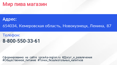 Мир пива, магазин по адресу 654034, Кемеровская область, Новокузнецк, Ленина, 87 в дальнейшем Организация, размещена в следующих категориях: