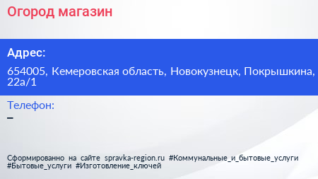 Огород, магазин по адресу 654005, Кемеровская область, Новокузнецк, Покрышкина, 22а/1 в дальнейшем Организация, размещена в следующих категориях: