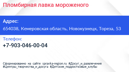 Пломбирная, лавка мороженого по адресу 654038, Кемеровская область, Новокузнецк, Тореза, 53 в дальнейшем Организация, размещена в следующих категориях: