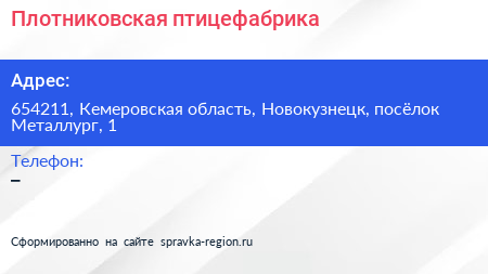 Плотниковская птицефабрика по адресу 654211, Кемеровская область, Новокузнецк, посёлок Металлург, 1 в дальнейшем Организация, размещена в следующих категориях: