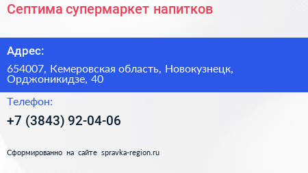 Септима, супермаркет напитков по адресу 654007, Кемеровская область, Новокузнецк, Орджоникидзе, 40 в дальнейшем Организация, размещена в следующих категориях:
