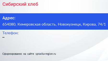 Сибирский хлеб по адресу 654080, Кемеровская область, Новокузнецк, Кирова, 74/1 в дальнейшем Организация, размещена в следующих категориях:
