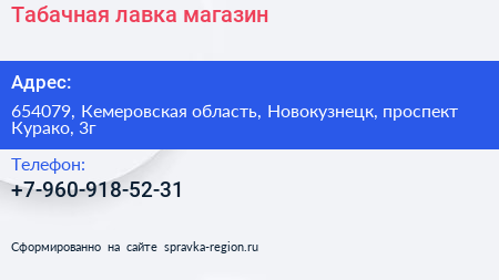 Табачная лавка, магазин по адресу 654079, Кемеровская область, Новокузнецк, проспект Курако, 3г в дальнейшем Организация, размещена в следующих категориях: