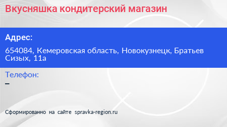 Вкусняшка, кондитерский магазин по адресу 654084, Кемеровская область, Новокузнецк, Братьев Сизых, 11а в дальнейшем Организация, размещена в следующих категориях: