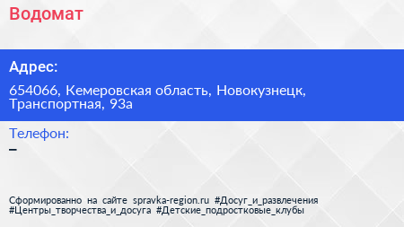 Водомат по адресу 654066, Кемеровская область, Новокузнецк, Транспортная, 93а в дальнейшем Организация, размещена в следующих категориях: