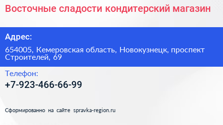Восточные сладости, кондитерский магазин по адресу 654005, Кемеровская область, Новокузнецк, проспект Строителей, 69 в дальнейшем Организация, размещена в следующих категориях: