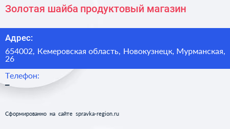 Золотая шайба, продуктовый магазин по адресу 654002, Кемеровская область, Новокузнецк, Мурманская, 26 в дальнейшем Организация, размещена в следующих категориях:
