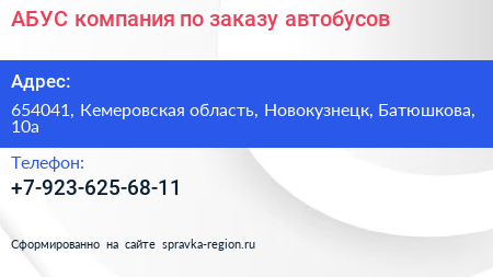 АБУС, компания по заказу автобусов по адресу 654041, Кемеровская область, Новокузнецк, Батюшкова, 10а в дальнейшем Организация, размещена в следующих категориях: