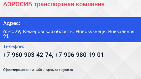 АЭРОСИБ, транспортная компания по адресу 654029, Кемеровская область, Новокузнецк, Вокзальная, 91 в дальнейшем Организация, размещена в следующих категориях: