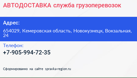 АВТОДОСТАВКА, служба грузоперевозок по адресу 654029, Кемеровская область, Новокузнецк, Вокзальная, 24 в дальнейшем Организация, размещена в следующих категориях: