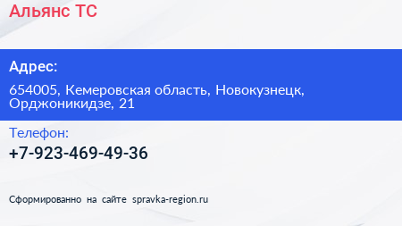 Альянс-ТС по адресу 654005, Кемеровская область, Новокузнецк, Орджоникидзе, 21 в дальнейшем Организация, размещена в следующих категориях: