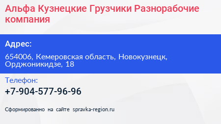 Альфа Кузнецкие Грузчики-Разнорабочие, компания по адресу 654006, Кемеровская область, Новокузнецк, Орджоникидзе, 18 в дальнейшем Организация, размещена в следующих категориях: