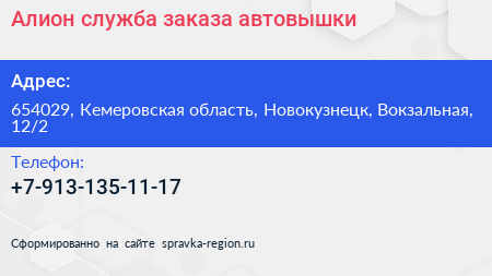 Алион, служба заказа автовышки по адресу 654029, Кемеровская область, Новокузнецк, Вокзальная, 12/2 в дальнейшем Организация, размещена в следующих категориях: