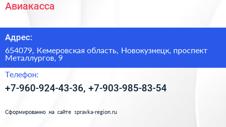 Авиакасса по адресу 654079, Кемеровская область, Новокузнецк, проспект Металлургов, 9 в дальнейшем Организация, размещена в следующих категориях: