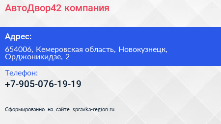 АвтоДвор42, компания по адресу 654006, Кемеровская область, Новокузнецк, Орджоникидзе, 2 в дальнейшем Организация, размещена в следующих категориях: