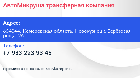 АвтоМикруша, трансферная компания по адресу 654044, Кемеровская область, Новокузнецк, Берёзовая роща, 26 в дальнейшем Организация, размещена в следующих категориях:
